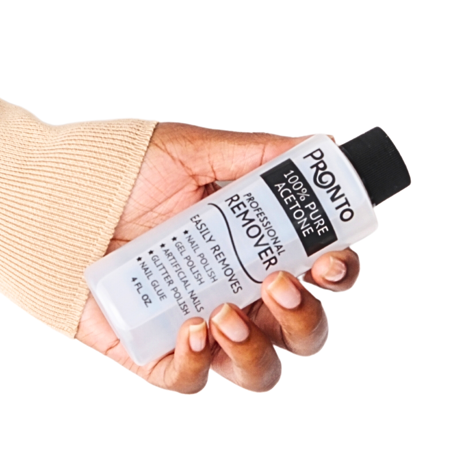 - THE ONLY ONE YOU NEED: Pronto Pure Acetone easily removes nail polish, gel or shellac polish, sculptured nail forms and nail art, artificial nails, glitter polish or nail glue. You can use our professional acrylic nail remover straight from our bottle or from an acetone dispenser.